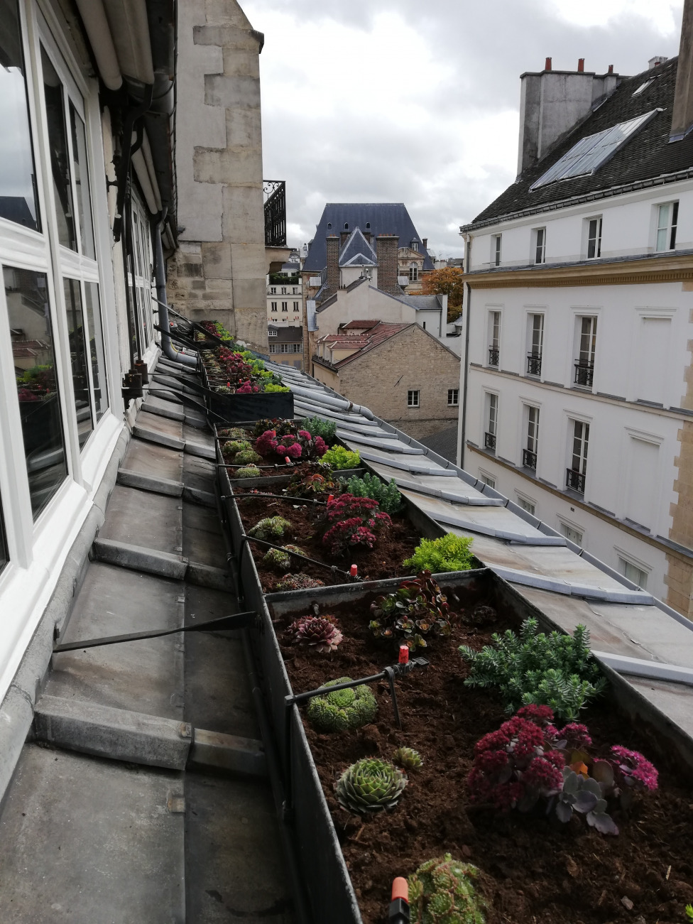 Fourniture et plantation de sédums sur le rebord de fenêtres parisiennes.