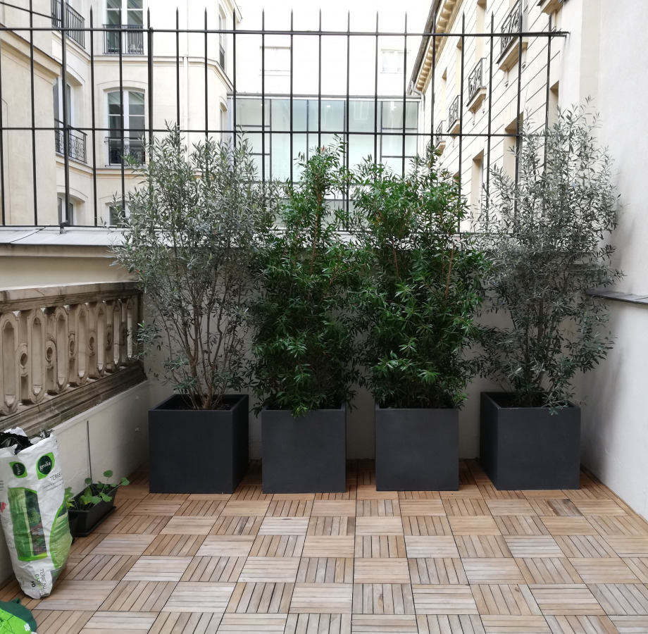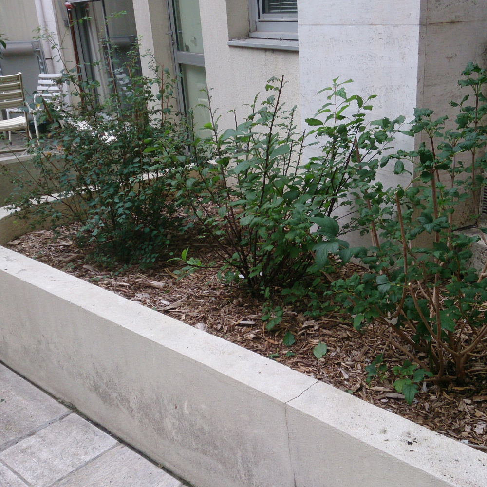 Plantation de quatre importants arbustes en bac au milieu d'une cour d'immeuble. Pour les finitions un paillage de pouzzolane a été mis en place.