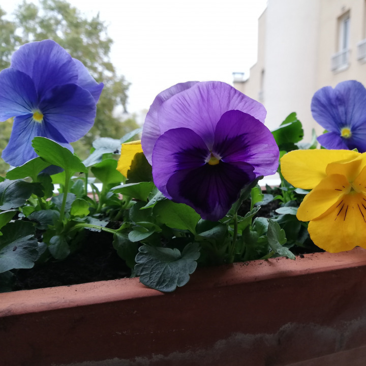 Fourniture et plantation de pensées en jardinière pour agrémenter un balcon.